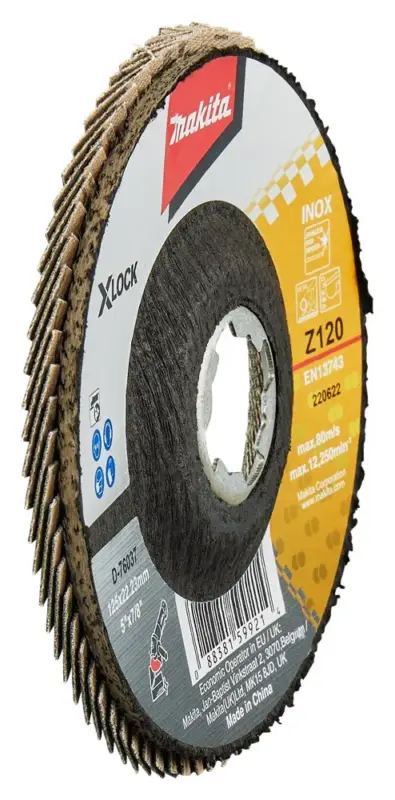 Lamellenschuurschijven zijn voorzien van lamellen bestaande uit een rug van vezelstof en korrels. Deze zijn geplaatst op een schijf met een rug van glasvezels. Doordat de schijf opgebouwd is uit lamellen is deze veerkrachtiger dan een schuurschijf en minder agressief voor het te bewerken materiaal. Bijzonder geschikt voor het schuren van lasnaden. Soorten korrel: Aluminiumoxide [A]: Zeer geschikt voor staal. Geschikt voor aluminium, non-ferro metalen en kunststoffen. Zirkoniumoxide [Z]: Zeer geschikt voor RVS. Geschikt voor staal, aluminium en non-ferro metalen. Keramisch aluminiumoxide [Ce]: Zeer geschikt voor RVS. Geschikt voor staal, aluminium en non-ferro metalen. Siliciumcarbide [S]: Zeer geschikt voor mortel en steen. Vom van de schijf: Vlakke schijven gebruik je voor het vlakschuren van oppervlakken. Plaatst deze onder een hoek van 0-15° op het materiaal voor een optimaal gebruik. Schuine schijven gebruik je voor het schuren van lasnaden, slijpen van vellingkanten en ontbramen. Plaats deze onder een hoek van 10-25° op het materiaal voor een optimaal gebruik. Korrels: 36/40: Lasnaadbewerking en vellingkanten. 60: Lasnaadbewerking, vellingkanten, ontbramen en vlakschuren. 80: Ontbramen en vlakschuren. 120: Vlakschuren. Hoogkwalitatieve Makita zirkonium-aluminiumoxide lamellenschijf schuin met glasvezel versterkte rug. Diameter 125mm met korrel 120.